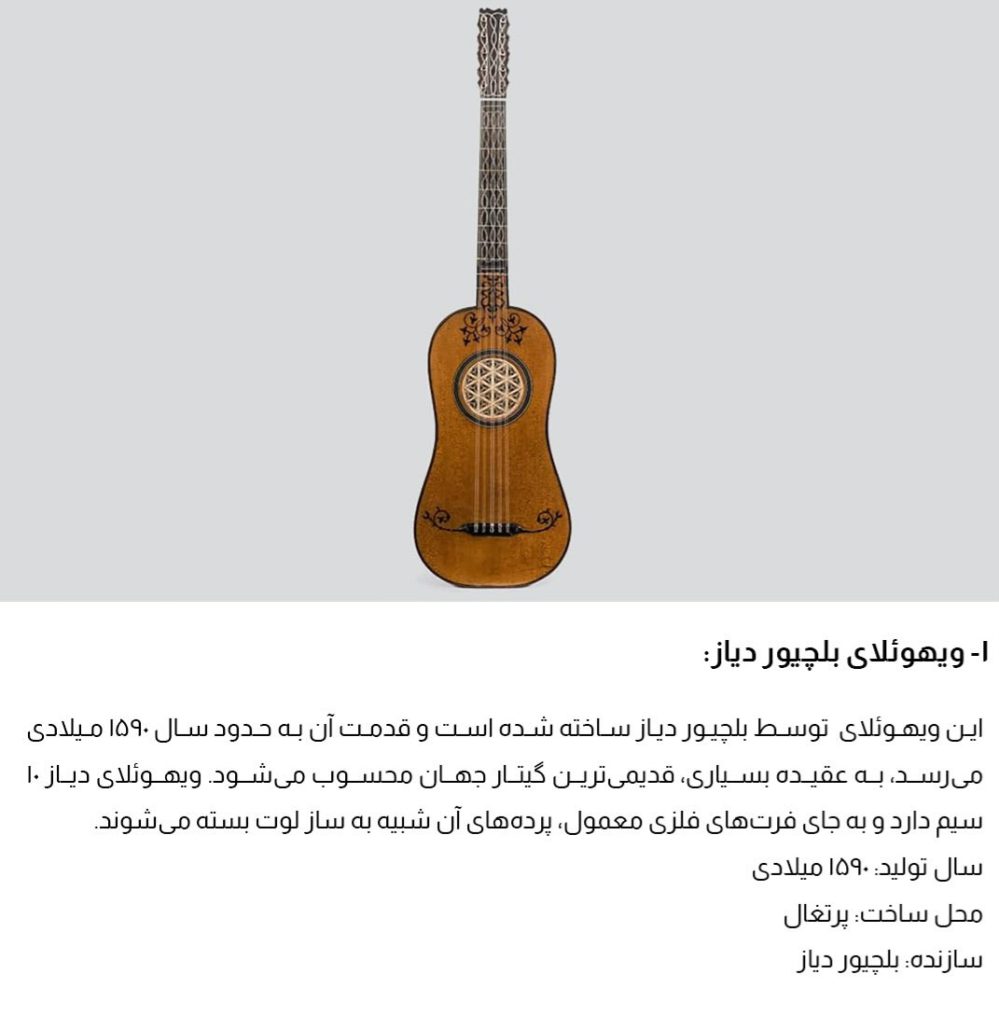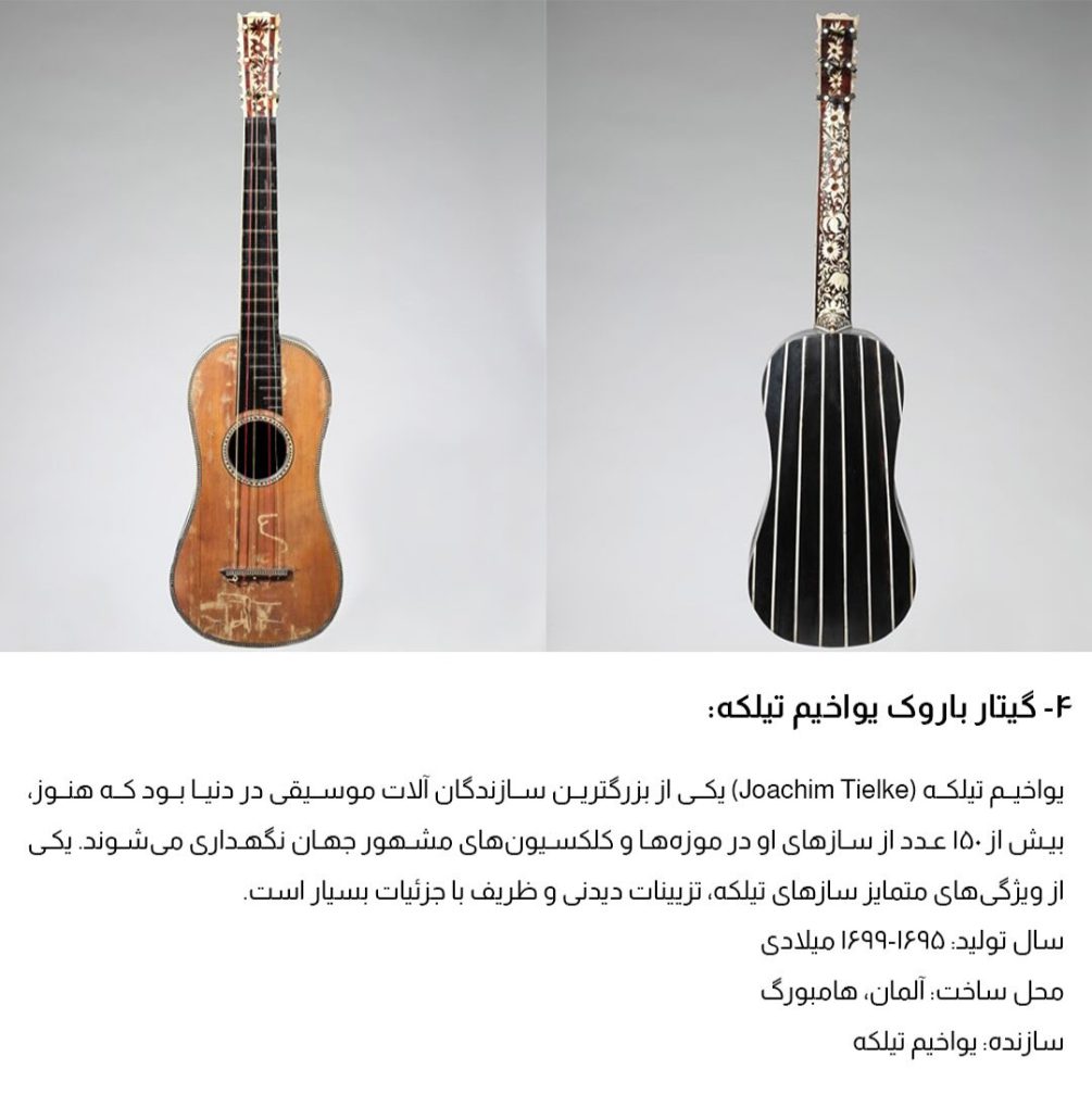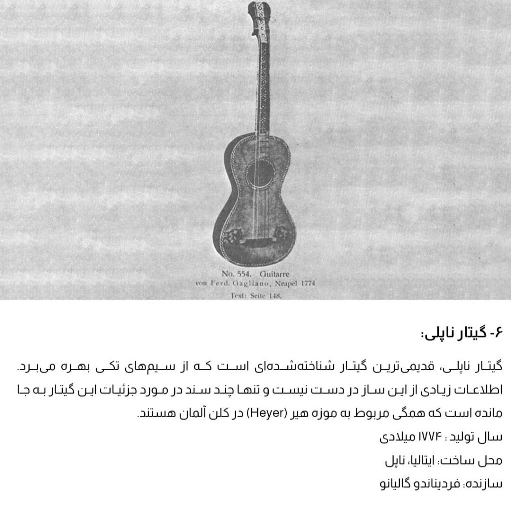 گیتار (Guitar) گیتار یکی دیگر از سازهای موسیقی معروف در جهان بوده که به صورت زه‌دار است و معمولا شش سیم دارد. این آلت موسیقی به شکل صاف در مقابل بدن فرد نوازنده نگه داشته می‌شود و با کمک انگشتان و یا پلکتروم نواخته می‌شود. گیتار برای اولین بار توسط فردی ایتالیایی که از خانواده نوازندگان معروف بود ساخته شد. وی گائتانو ویناچیا (Gaetano Vinaccia) نام داشت، ویناچیا به همراه برادرش گیتار شش سیم را در حدود سال ۱۷۷۶ اختراع کردند. امروزه انواع مختلفی از گیتارها همچون گیتارهای آکوستیک، الکتریک، دوازده سیم و استیل وجود دارند.